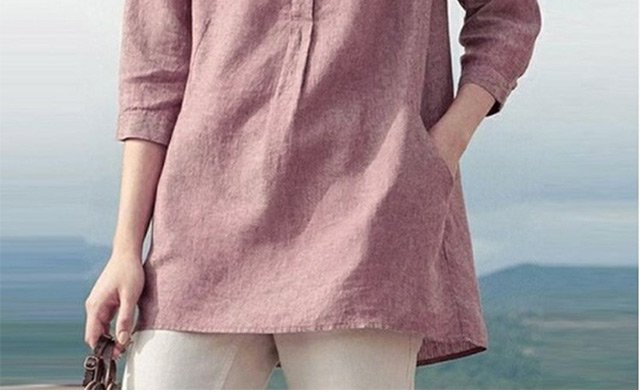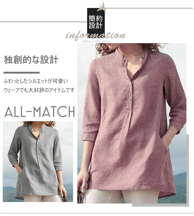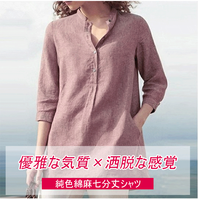 レディース無地七分丈綿麻シャツ